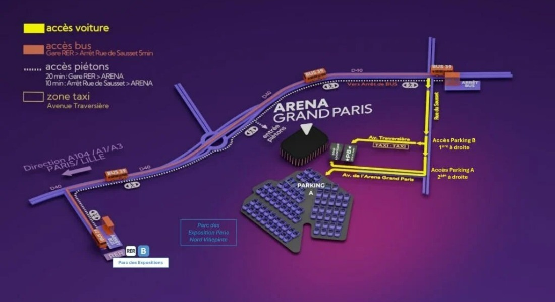 Depuis Paris ou l'aéroport Charles de Gaulle, l'Arena Grand Paris est accessible via le RER B, en descendant à la station Parc des Expositions de Villepinte.